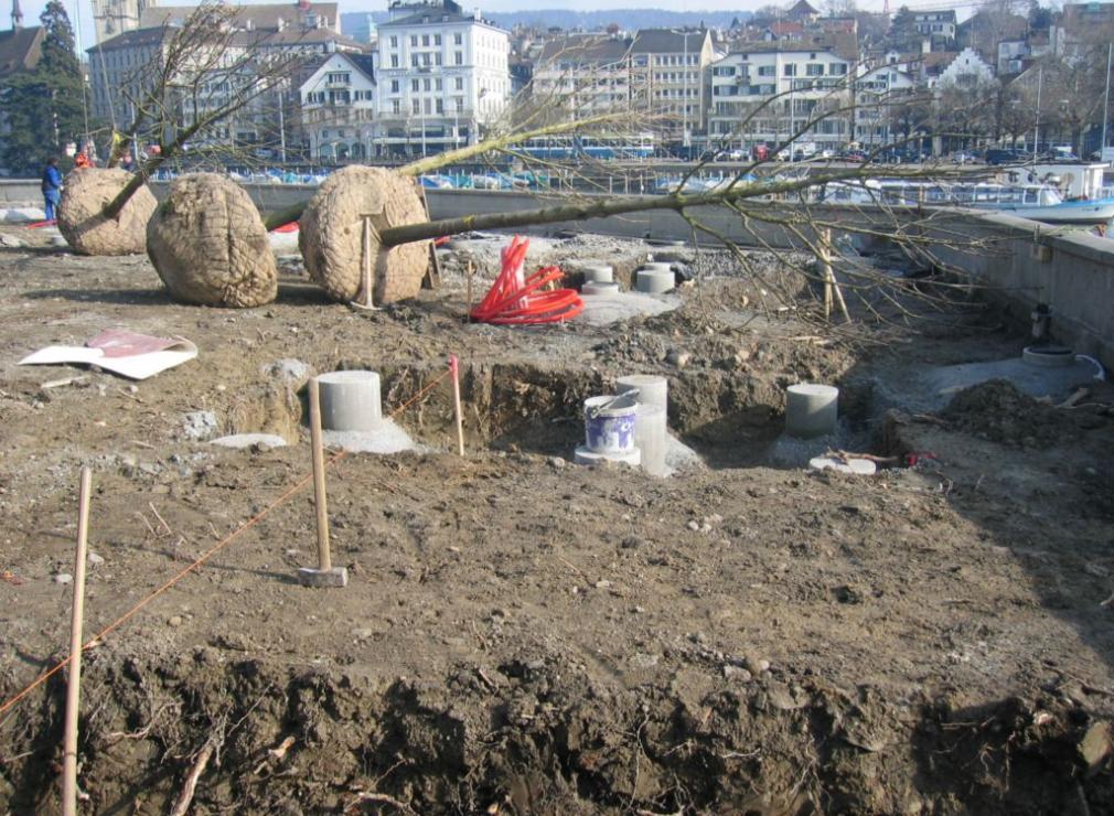 Spezialfundamente für Zirkus- und Oktober-Festzelt. Baumgruben, Kies-Chaussierung und hochstämmige Allebäume.