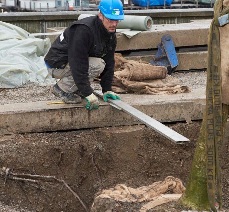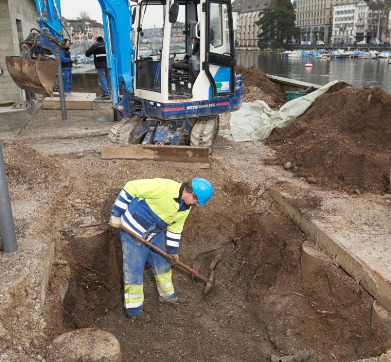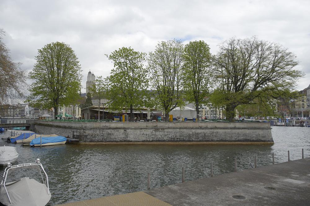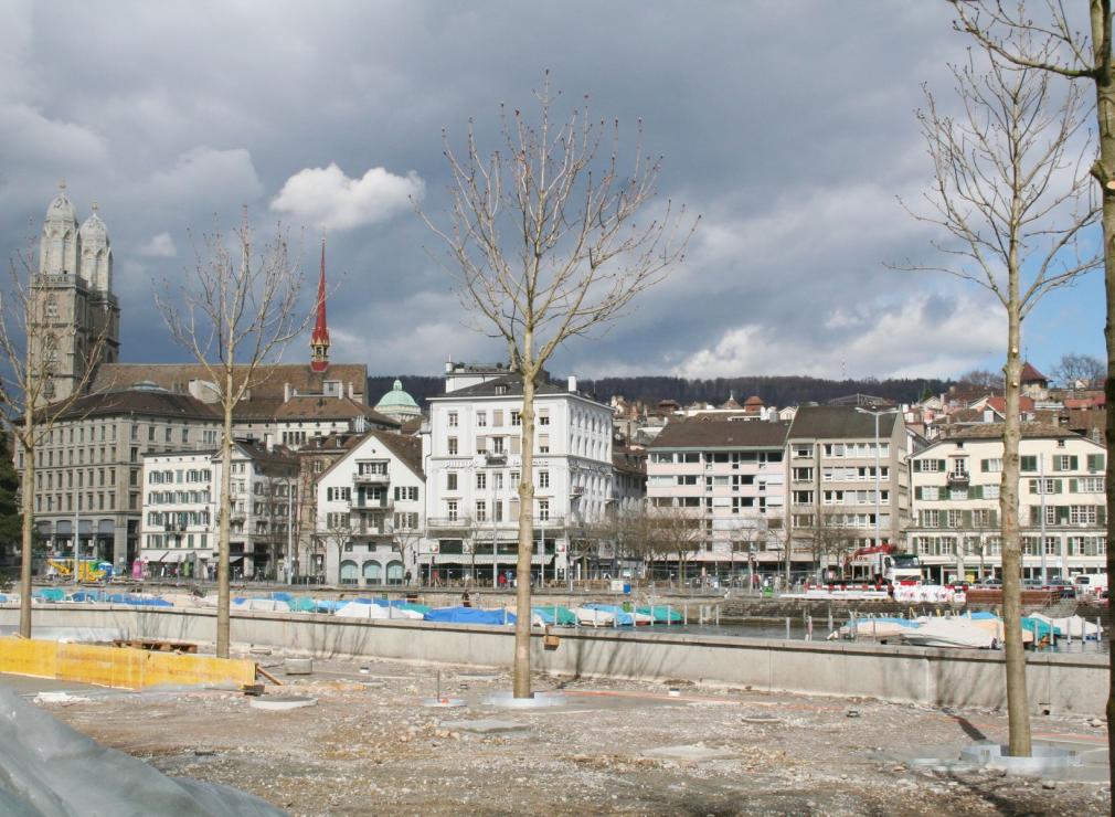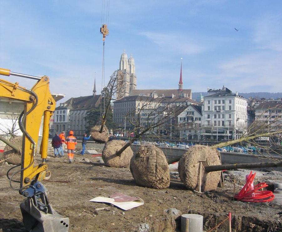 Sanierung des Bauschänzli an der Limmat in Zürich. Hier war die Logistik sehr anspruchsvoll. Etliche Tonnen Kies, Stahl, Beton, Erde und Bäume mussten nach einem genauen Terminplan angeliefert, auf die Insel gehievt und eingebaut werden. Planung und Bauführung durch Hager Partner AG, Landschaftsarchitekten.