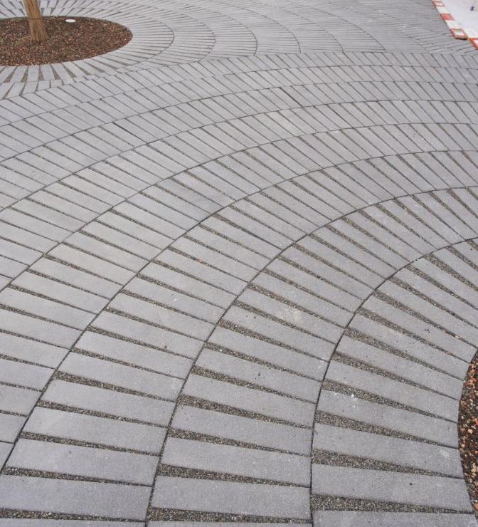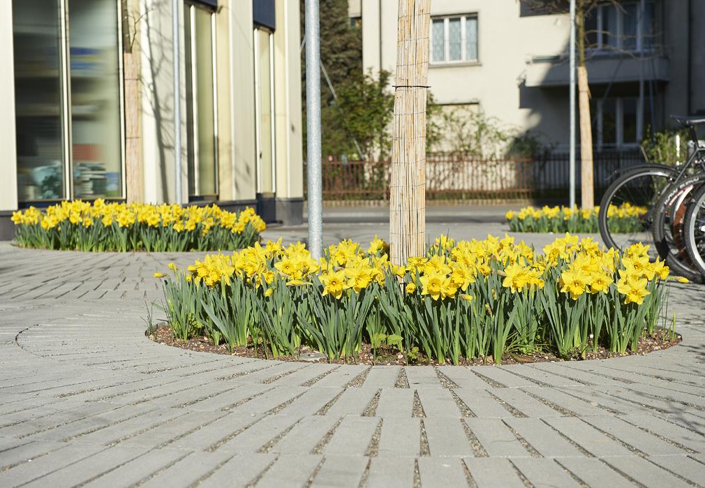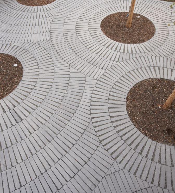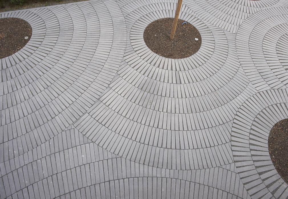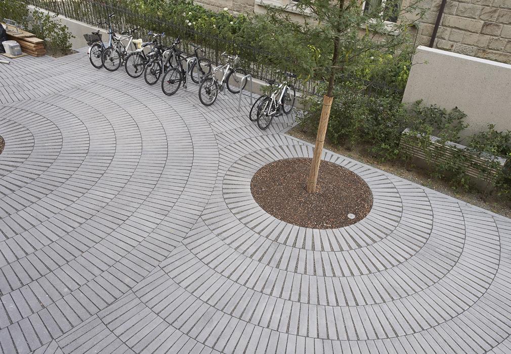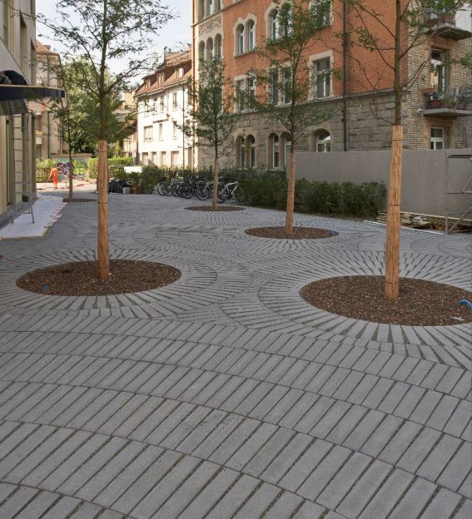 Hinterhof: Fundationsschichten, spezieller Bodenbelag aus Betonelementen, Baumgruben und Bepflanzung.