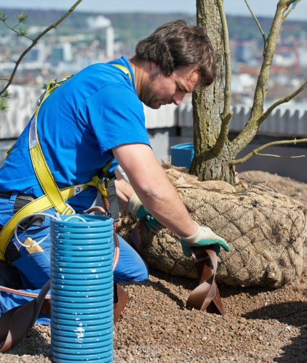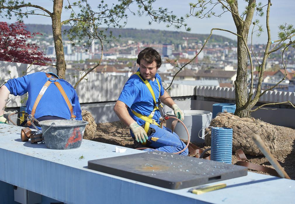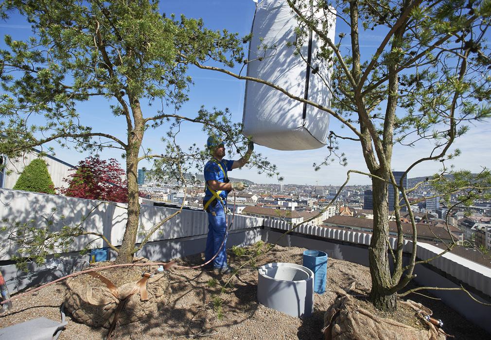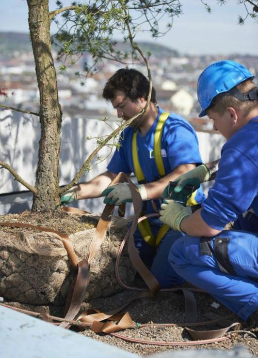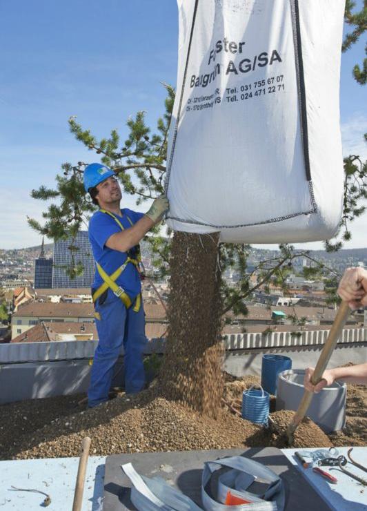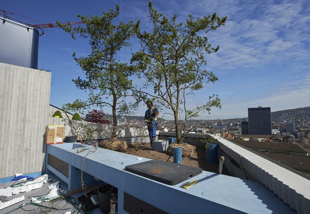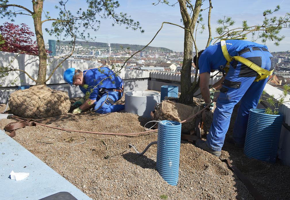 Dachgarten: Schutz der Dachabdichtung, Pflanzvorbereitung, Dachgarten-Substrat einbauen, Bepflanzung, Bäume mit Ballenankern und zusätzlichen Drahtseilen sichern.