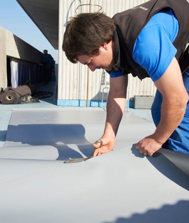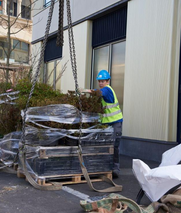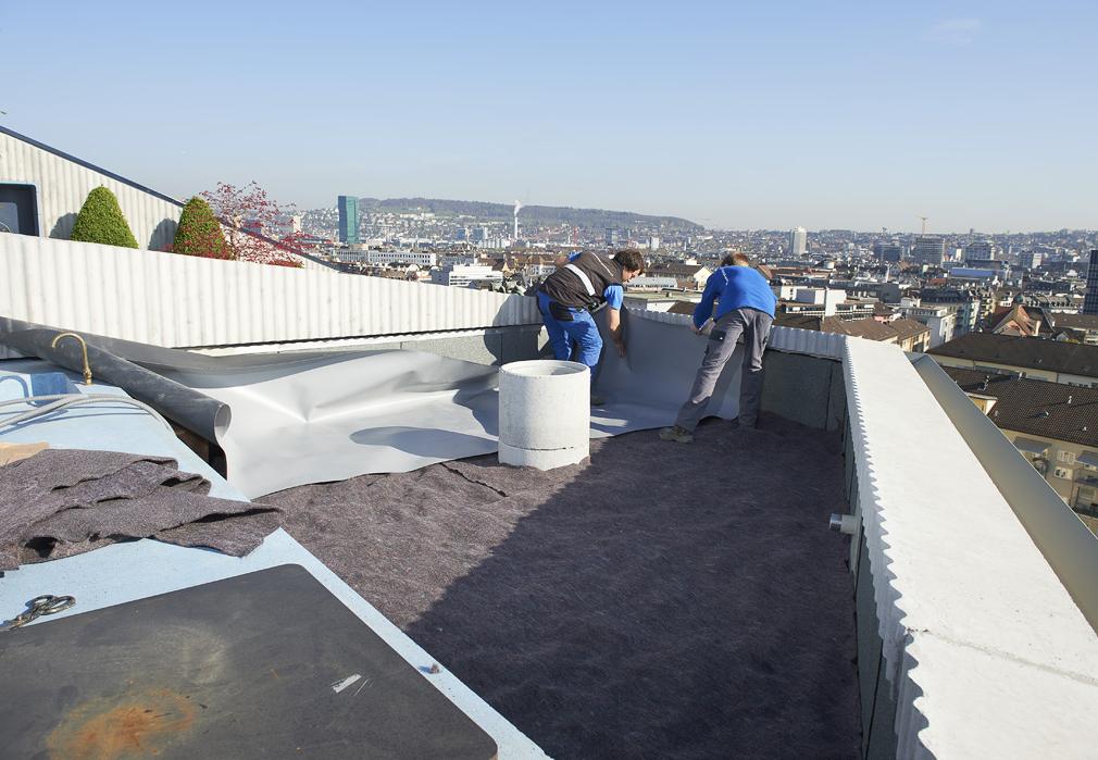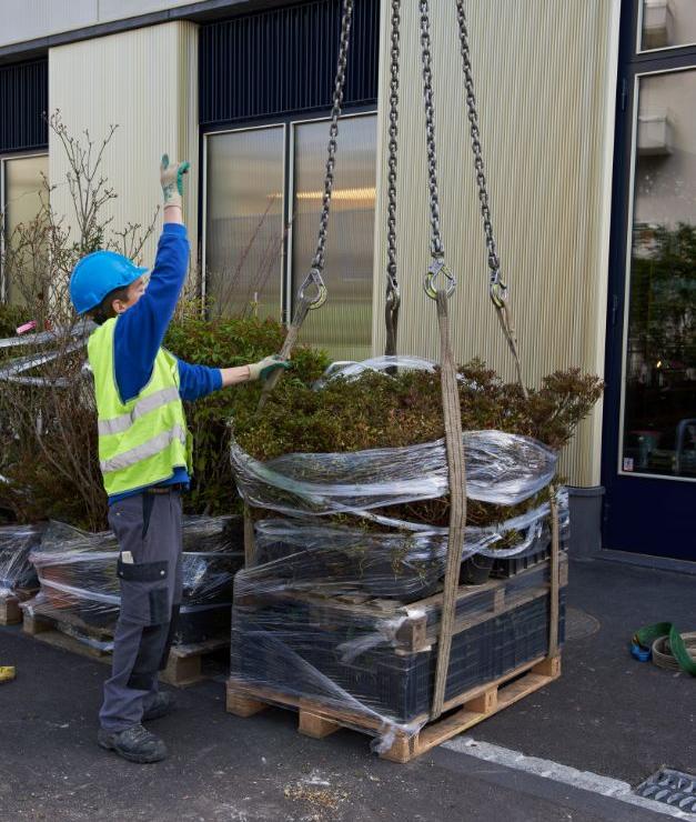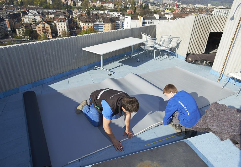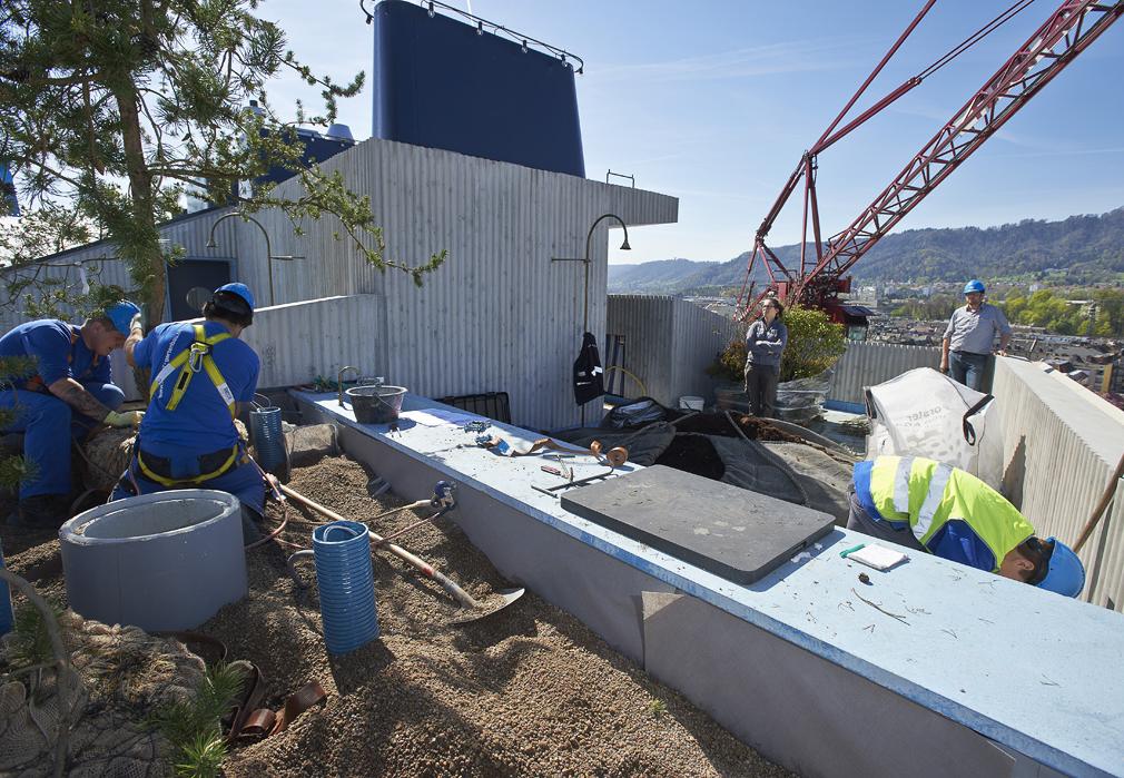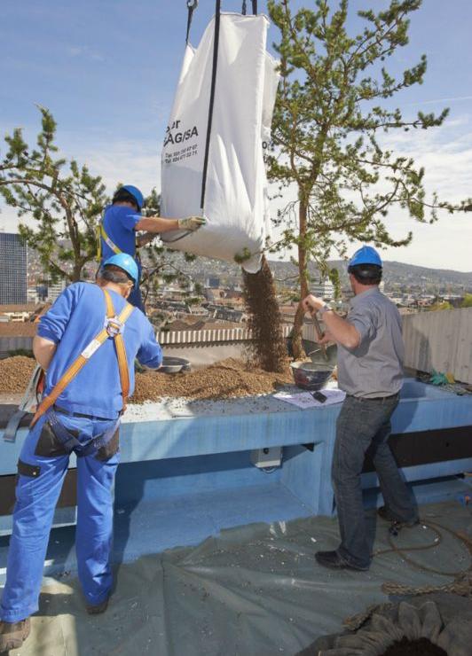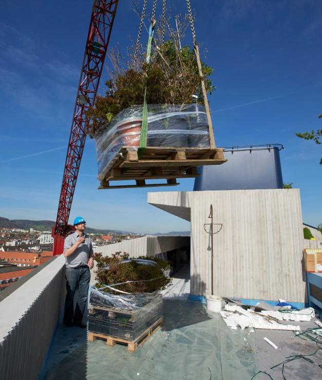 Dachgarten: Schutz der Dachabdichtung, Pflanzvorbereitung, Dachgarten-Substrat einbauen, Bepflanzung, Bäume mit Ballenankern und zusätzlichen Drahtseilen sichern.