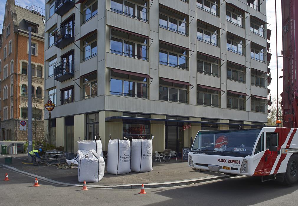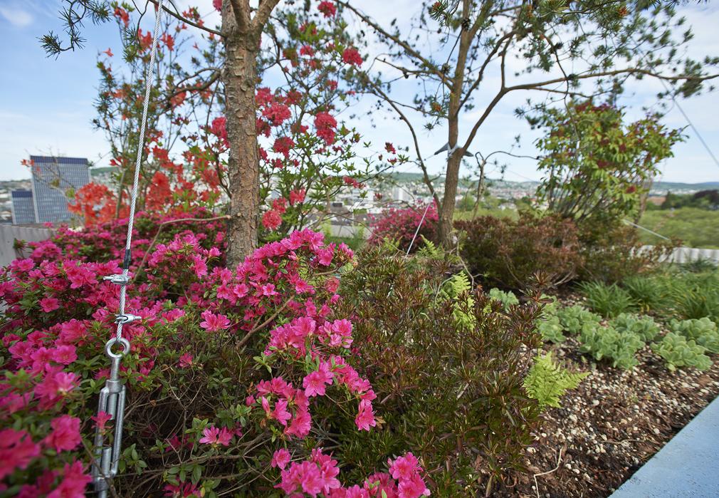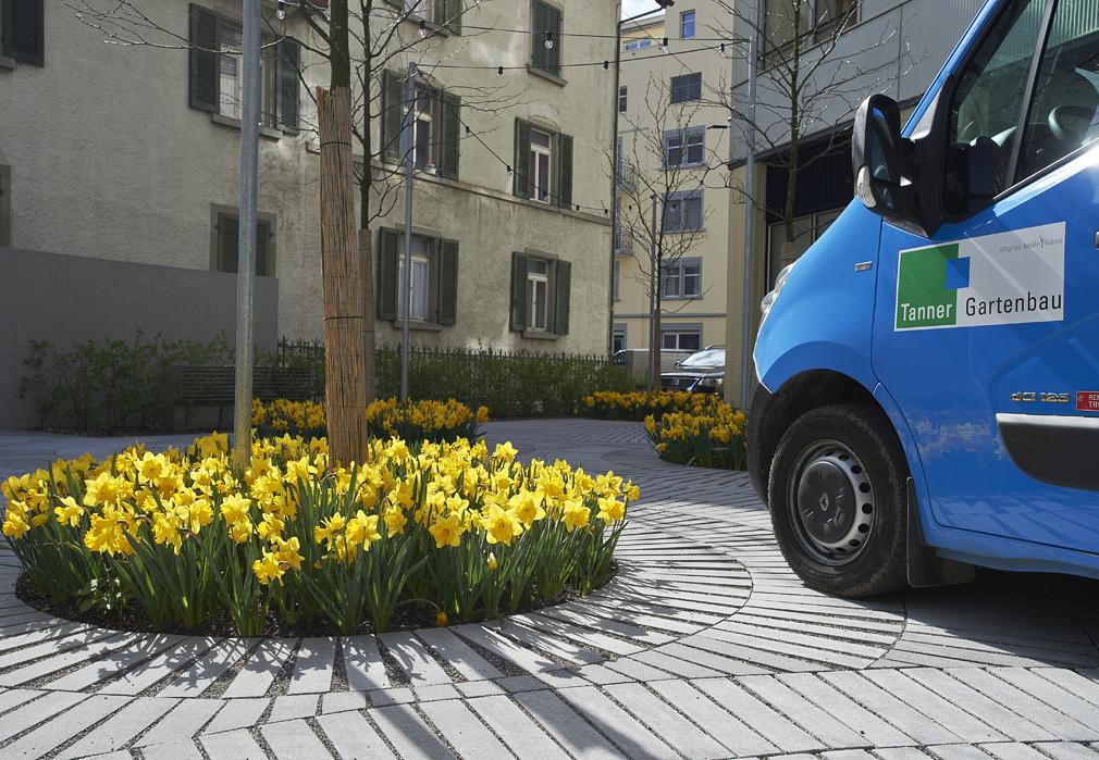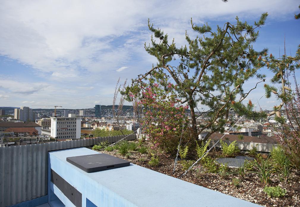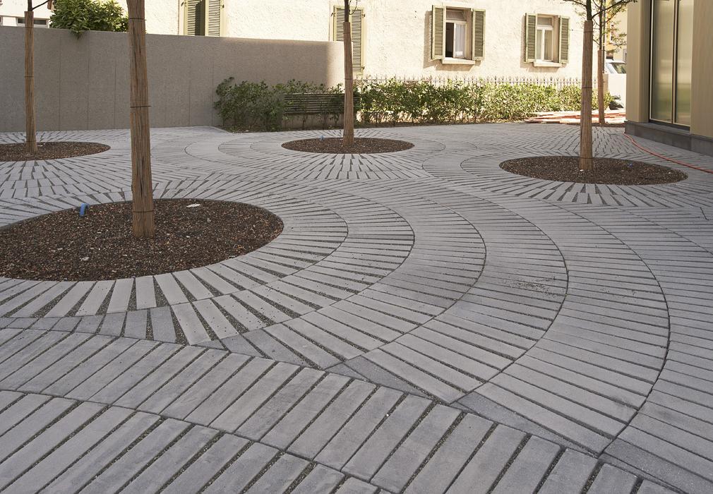 Ein Geschäfts- und Wohnhaus in Zürich bekam einen speziellen Hinterhof. Bemerkenswert ist der aussergewöhnliche Bodenbelag mit seinem einmaligen Muster. Eine Herausforderung war auch der Dachgarten im 13ten Stock. In dieser Höhe Bäume und Sträucher zu pflanzen muss gut durchdacht sein. Planung und Logistik waren besondere Schlüsselpunkte.
