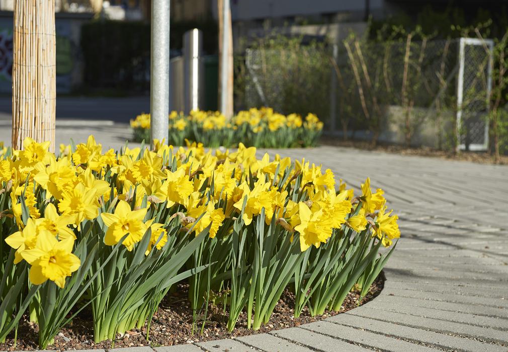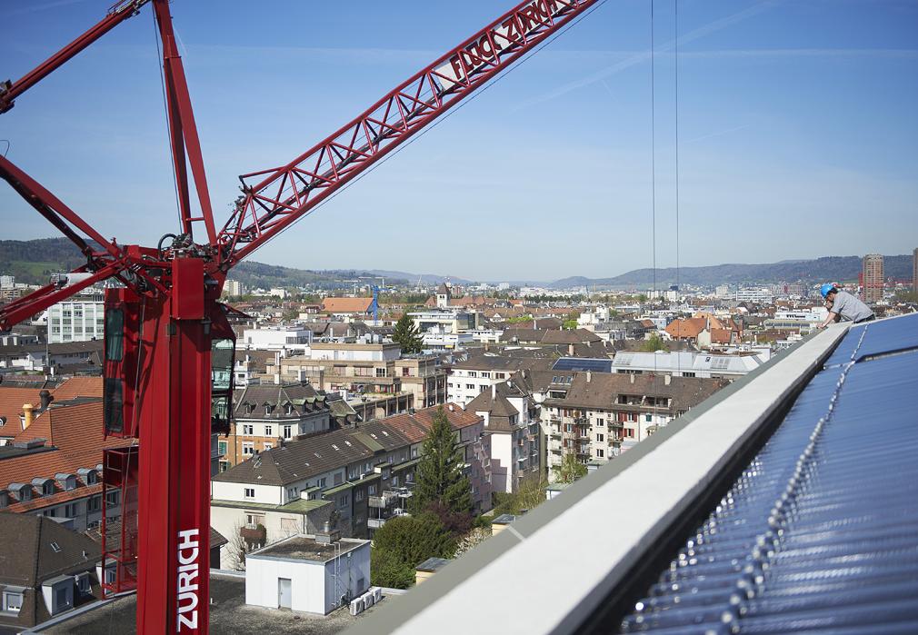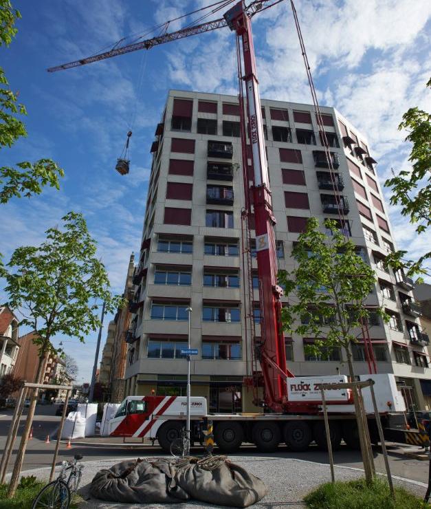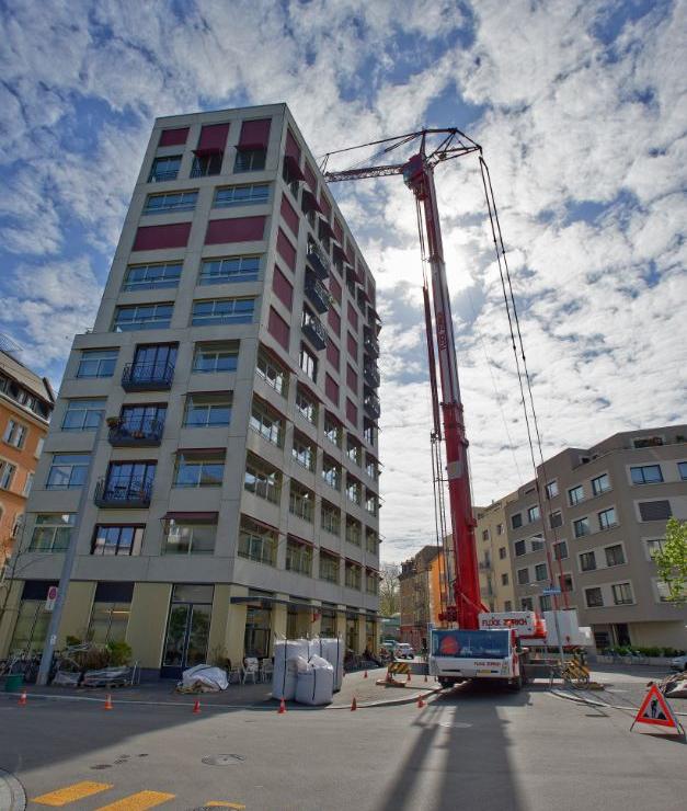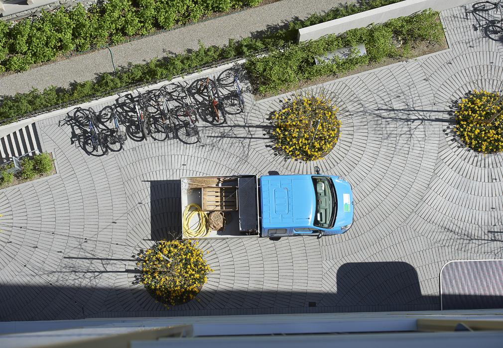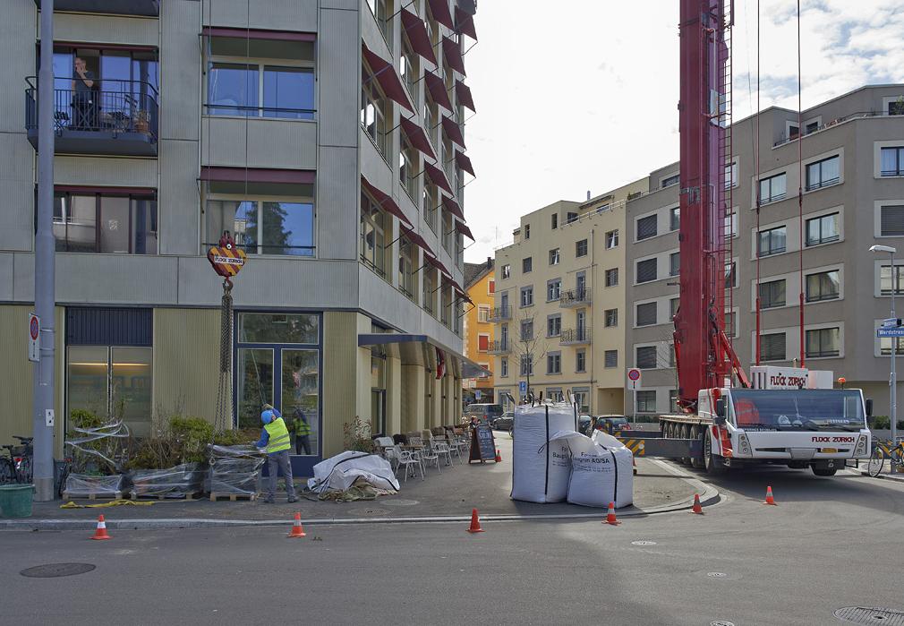 Ein Geschäfts- und Wohnhaus in Zürich bekam einen speziellen Hinterhof. Bemerkenswert ist der aussergewöhnliche Bodenbelag mit seinem einmaligen Muster. Eine Herausforderung war auch der Dachgarten im 13ten Stock. In dieser Höhe Bäume und Sträucher zu pflanzen muss gut durchdacht sein. Planung und Logistik waren besondere Schlüsselpunkte.